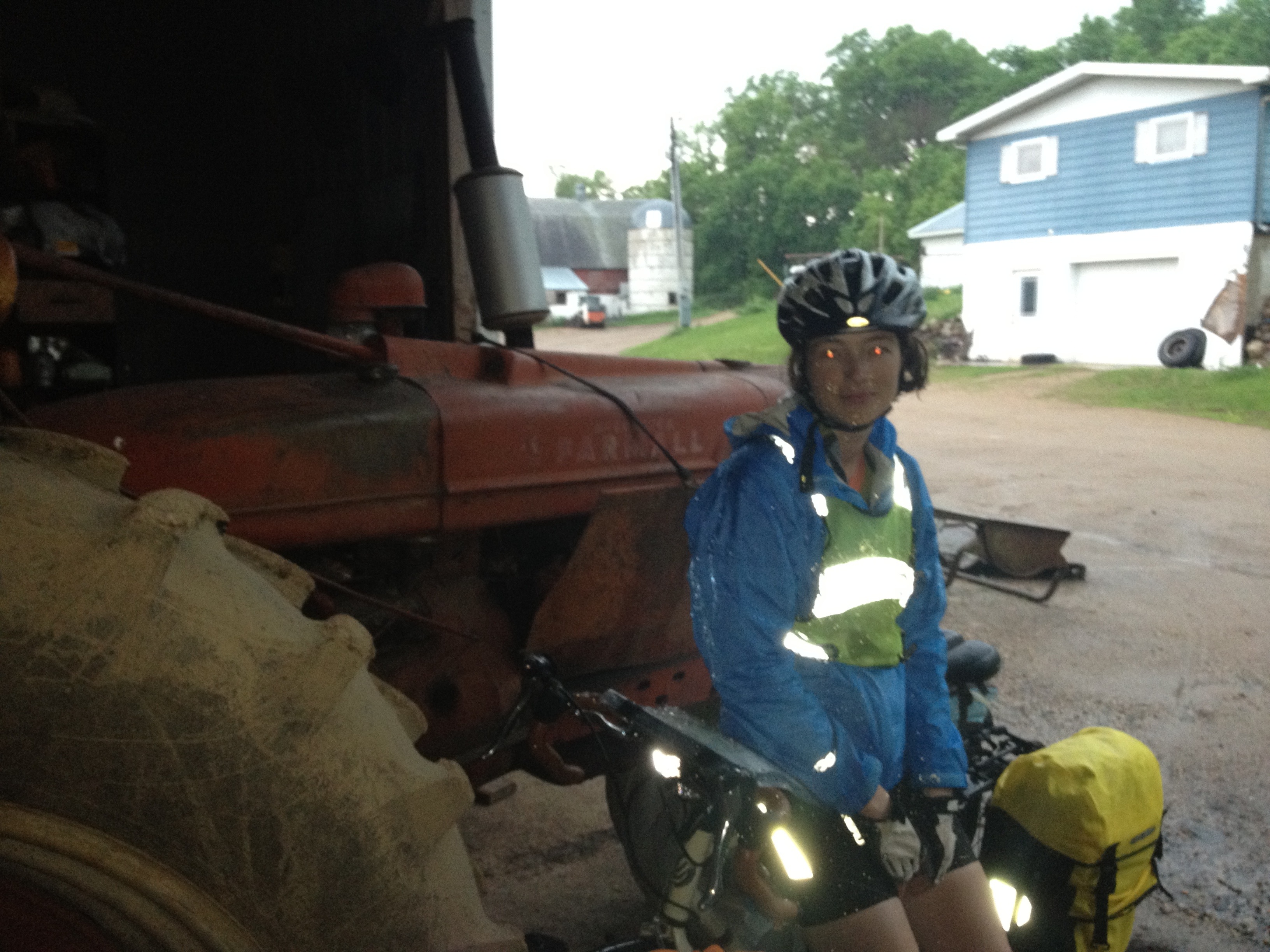 We left Long Prairie when what looked like a potential break in the front opened up, around 2:30. We made it nine miles before the break-that-was-not-a-break hit, right as we arrived at a conveniently located dairy farm. We waited out the torrential downpour and epic lightning in their equipment shed, chatted with the farmers, and petted Sparky the dog.