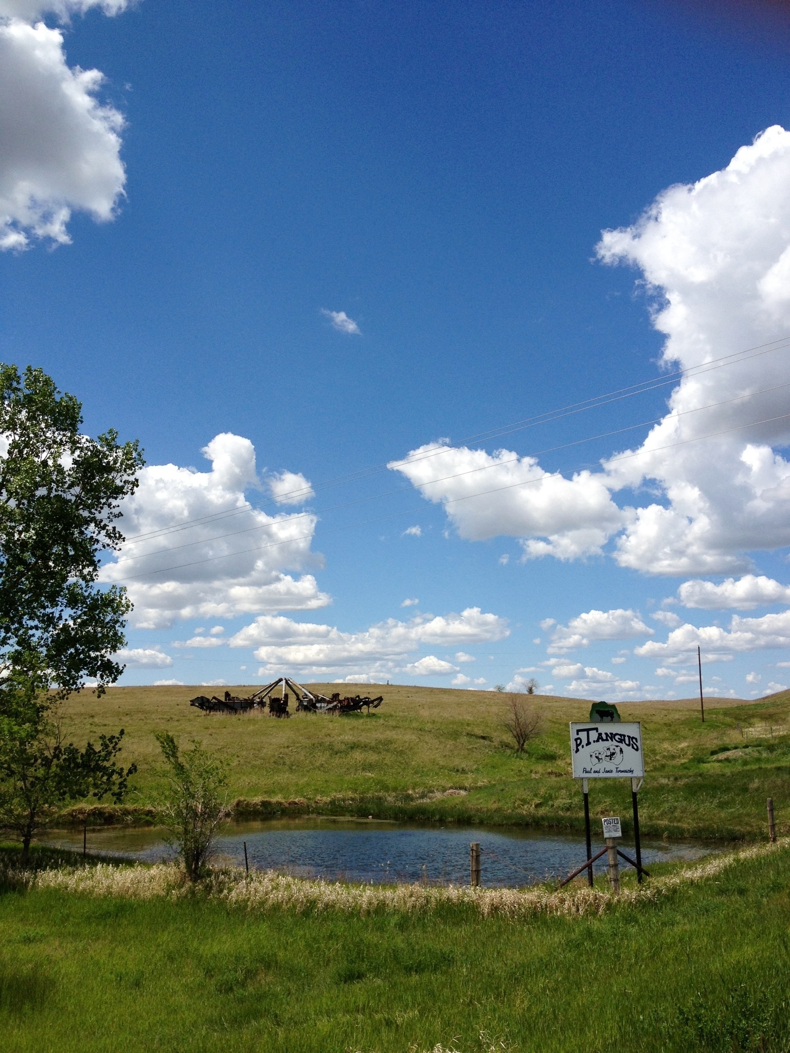 We woke this morning to beautiful skies and a brisk wind out of the northwest. After a delicious and filling breakfast at the Glen Ullin gas station (seriously) we rode off through more rolling prairie that changed back to farmland as the day went on. Steam threshers continue to be a part of the scenery; evidently arranging them artfully is something of a north dakotan art form. We found these guys high fiving: