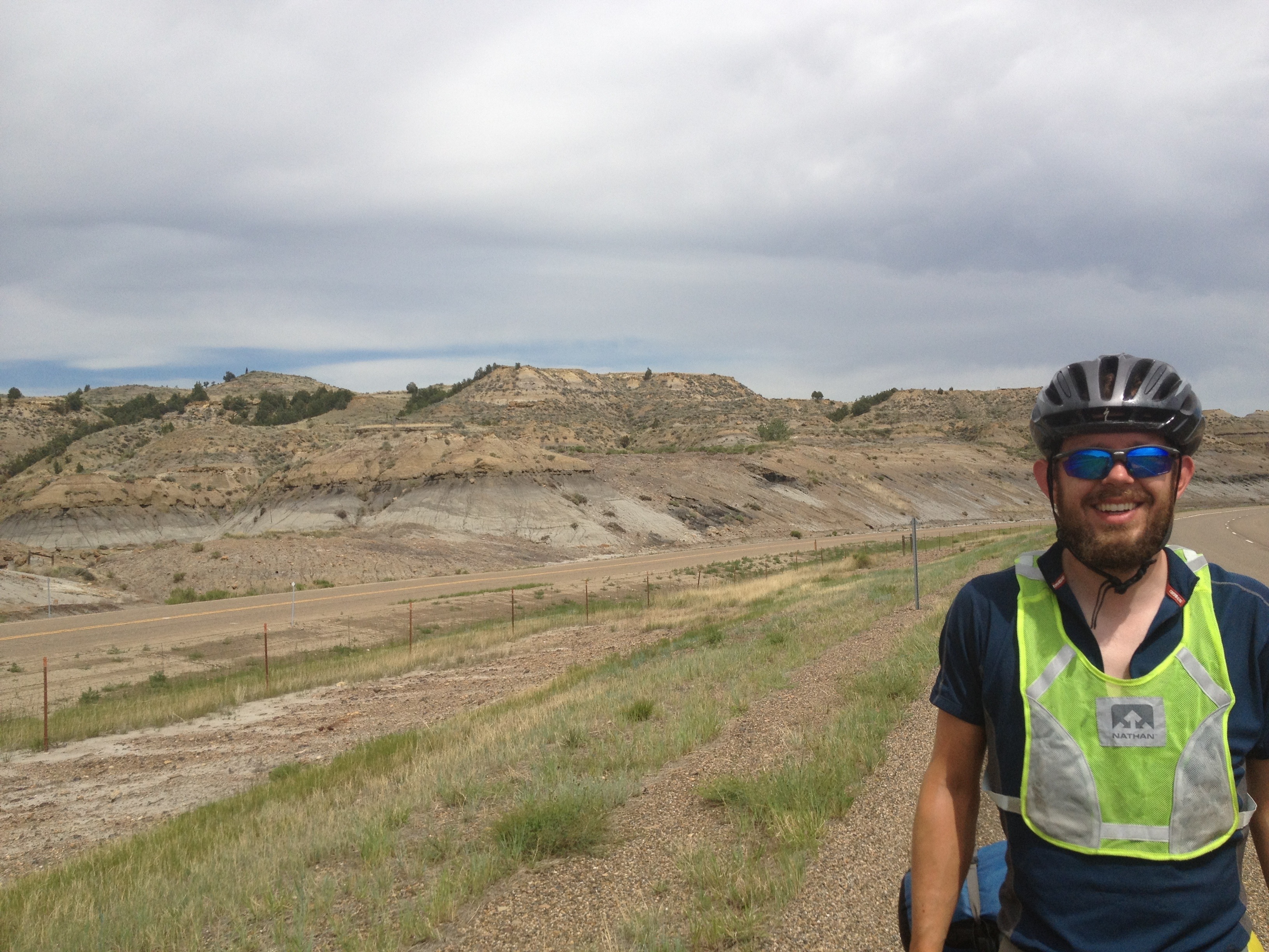 The temperature has been steadily climbing ever since we reached the badlands. After tomorrow it’s supposed to drop again, thankfully. It’s hard to believe that just a few days ago we were worried about hypothermia. Today, biking along the interstate from Medora, we sought out the one bit of shade we could find for lunch, a thornbush along the edge of the right-of-way, growing up against a barbed wire fence. We crawled underneath the bush to eat our peanut butter and cheese sandwiches, not able to move much because we’d either get scratched or expose a limb to the sun. Funny to think that we’ll be in snow at the other end of this state.