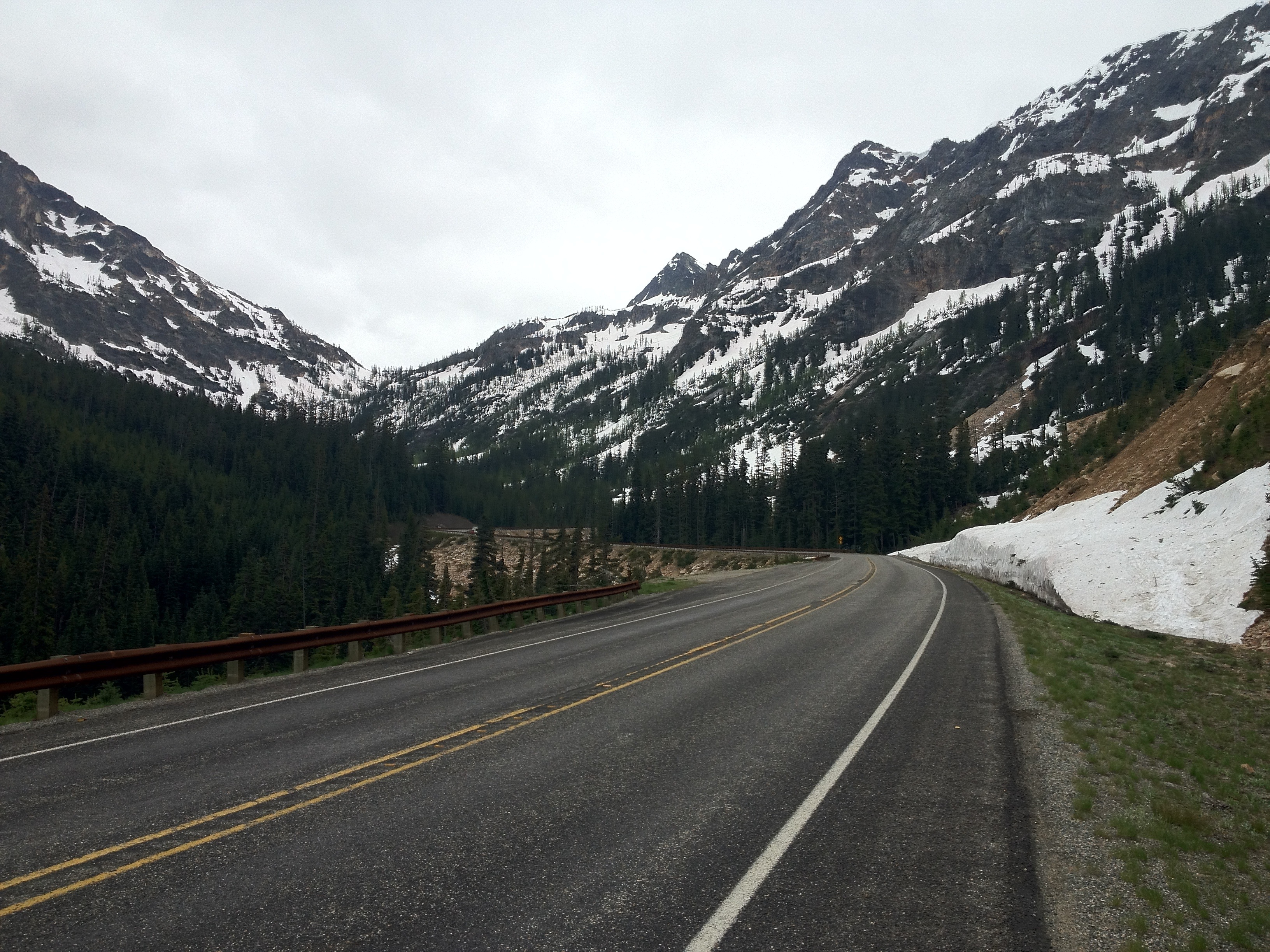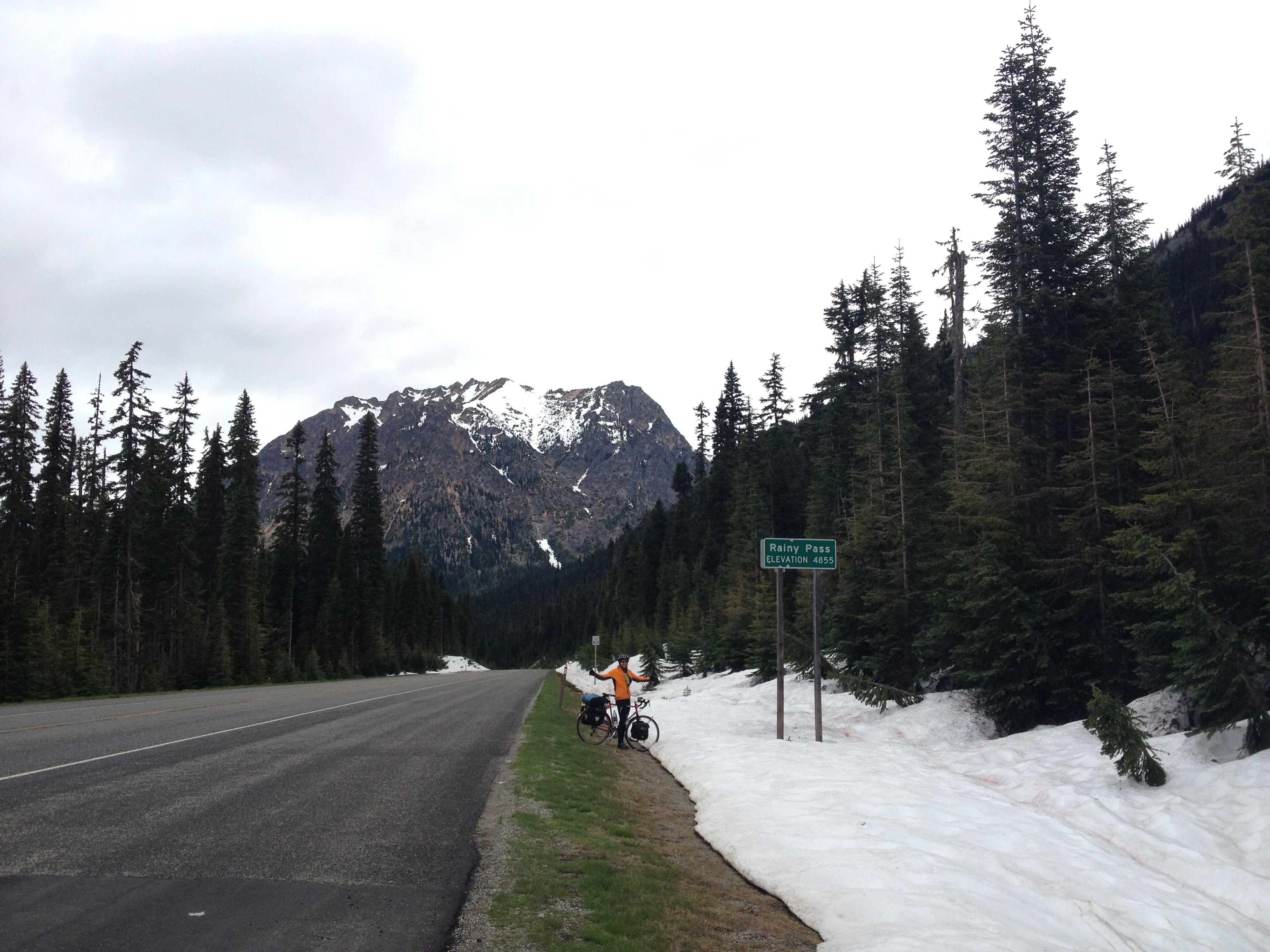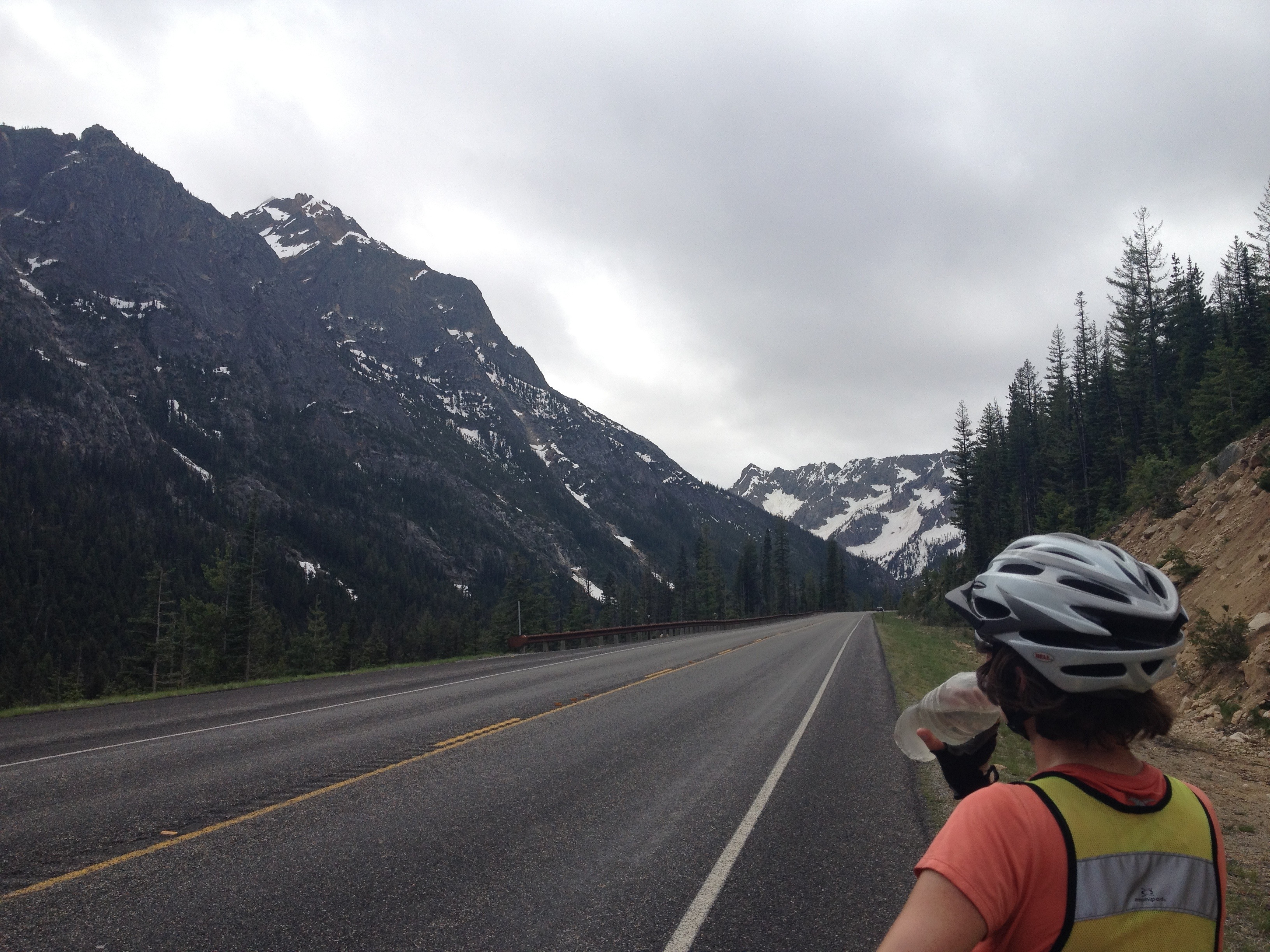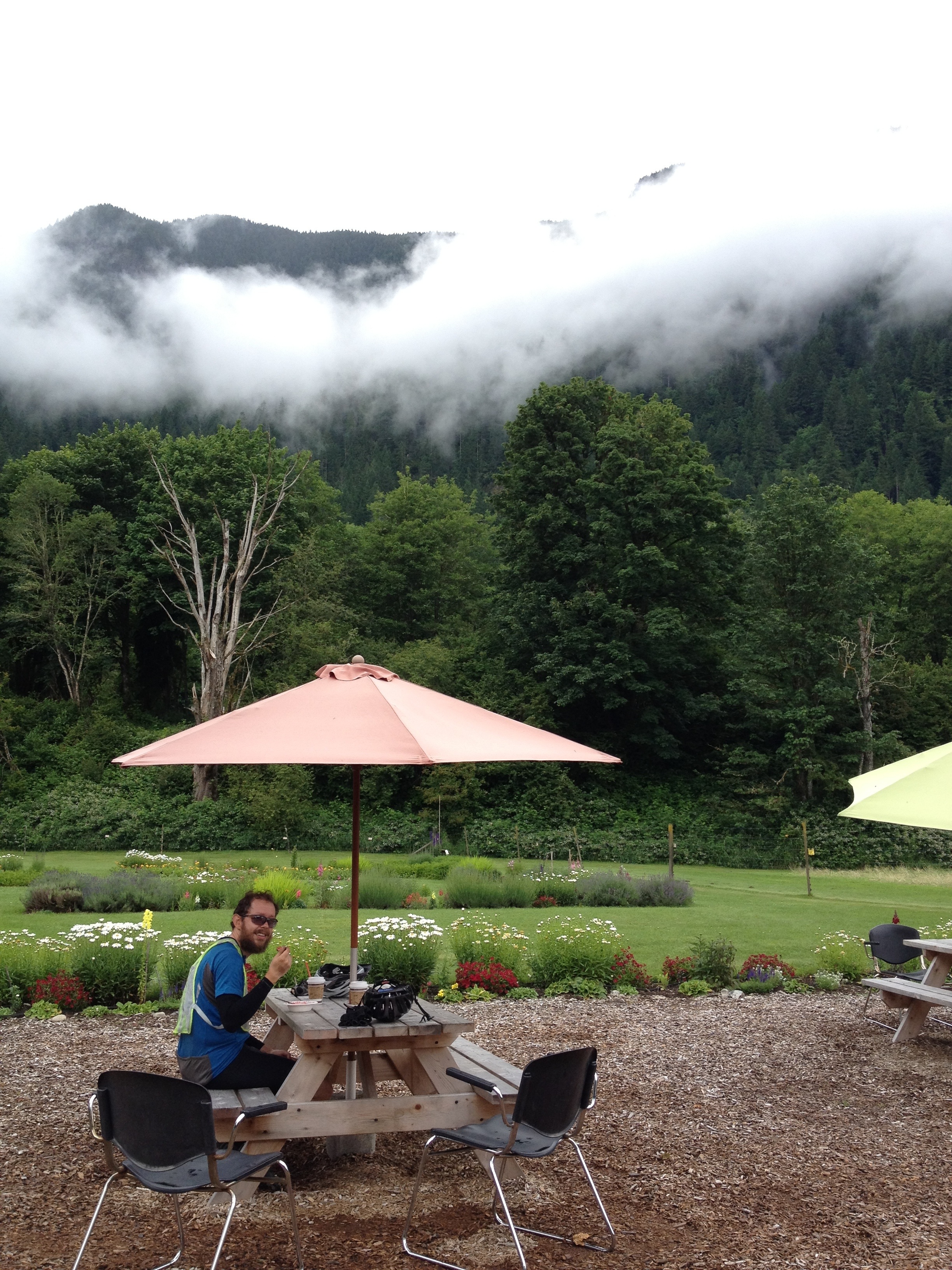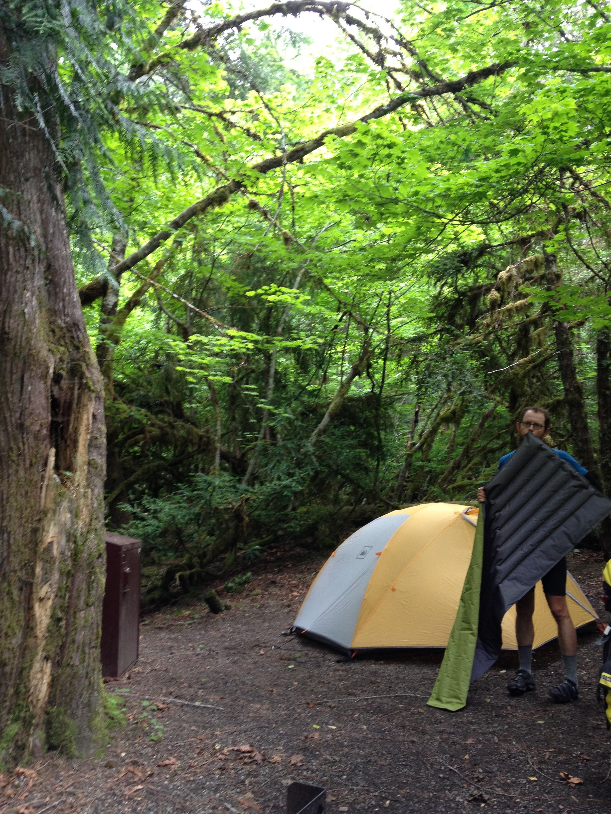 This landscape is just stunning and it amazed me the whole ride up that it is even passable by bicycle at all. It’s also amazing how much the environment here on the west side of the Cascades is worlds away from the desert valley we were in yesterday–our campground is lush and green; all the trees are dripping with moss, and it’s a small miracle that it actually didn’t rain at all today, other than a few drips at the pass.