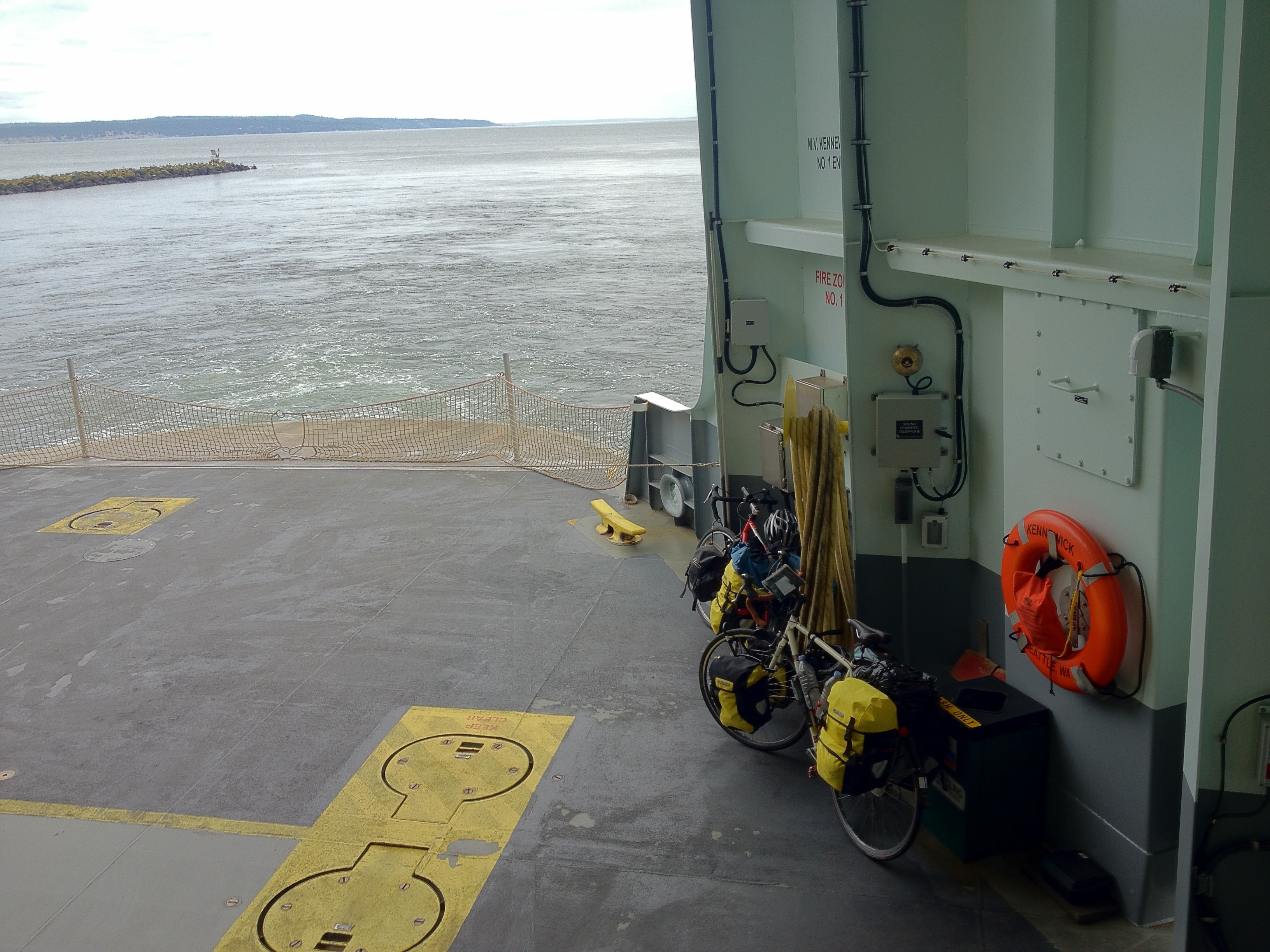 Sunday night we spent at Fort Worden State Park, where there was an unexpected fiddling conference taking place. All the campsites were reserved (including the hiker biker sites which are normally not able to be reserved) but a friendly fiddler let us pitch our tent in the corner of his site. Monday, we biked down the peninsula to Bainbridge, getting lost for the first time since Ohio. I misread a sign and asked Susan if we were supposed to turn; she heard my question as a direction, and I took her making the turn as confirmation that my misreading was correct. A few miles later we were extremely confused to be right back where we had been earlier in the day… the wrong turn had lead us in a long circle, which was fortunate as we might have wound up much farther off route otherwise. I think the whole thing only took us about 8 extra miles but again it seemed like a good indicator that we were ready to be done.