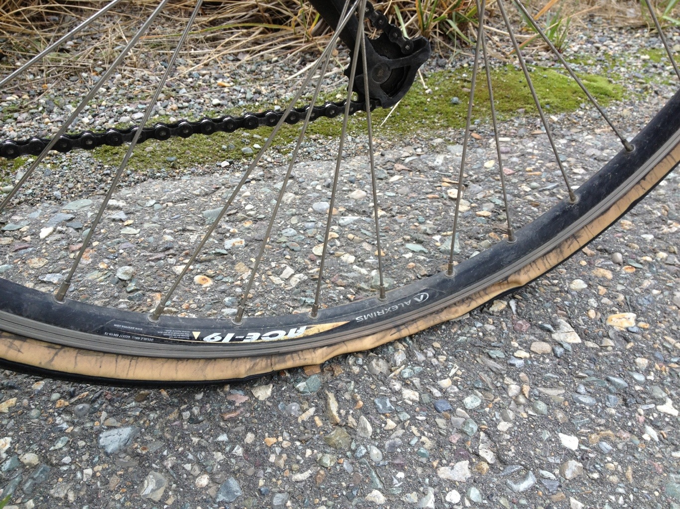 There was a teensy problem, though. On one downhill, I was peering intently at the map, trying to make out something printed in fine print, when I ran over a big rock on the shoulder in such a way that it ripped the wall of my rear tire and caused a blowout: (A blowout is when the tube explodes from being forced out a hole in the tire while under pressure.)