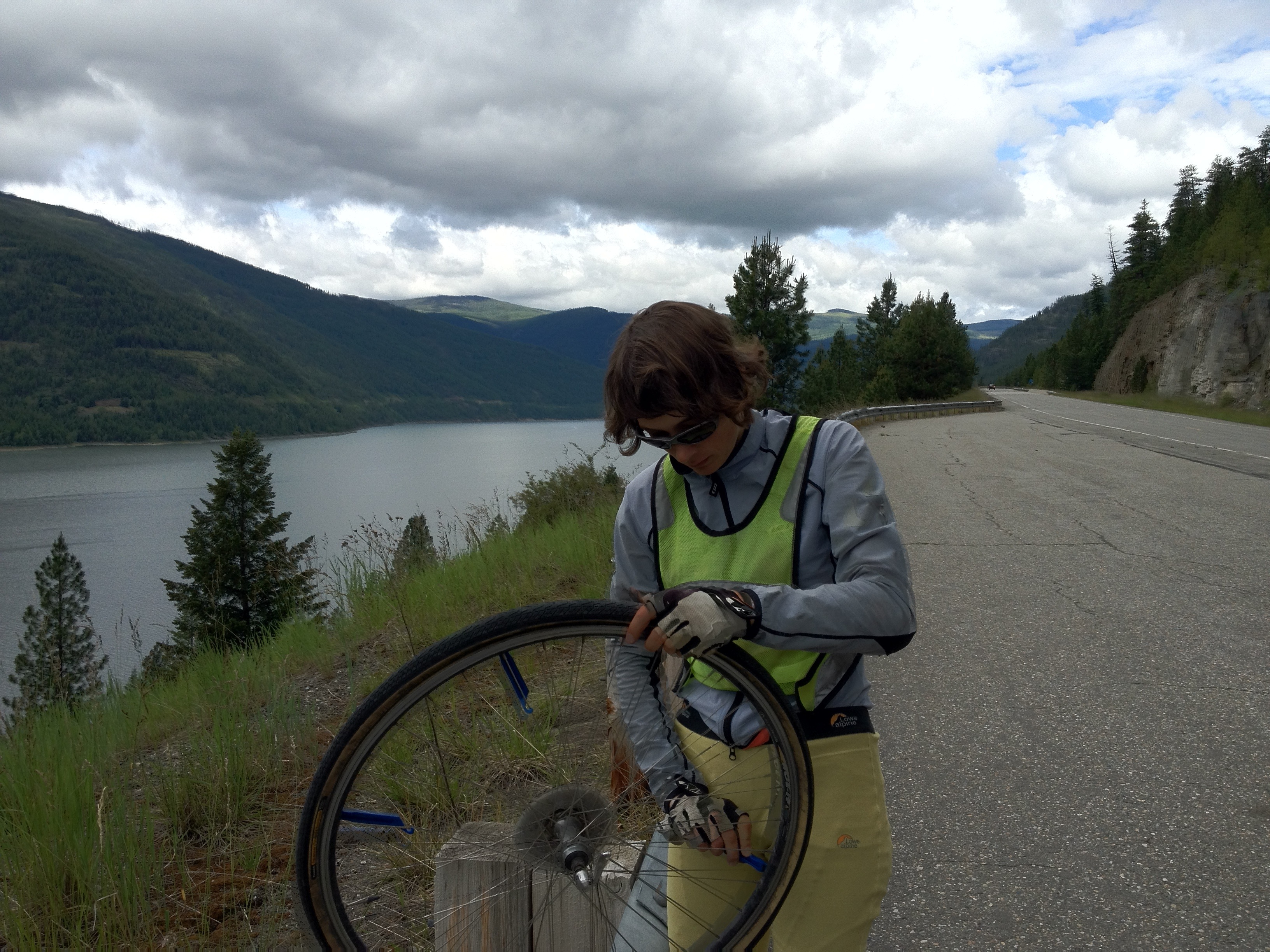 We made it all the way into Idaho, just a few miles short of our destination of Clark Fork, when one of the patches in Susan’s tube gave up. I’ve never had a patch leak like that before but probably the extra room in the tire due to the blowout is to blame. We put a new tube in and got George back in place, got back on the bikes, and my wheel was flat. At this point it was about 19:00 but fortunately the sun is up late. Another metal shard had punched through my rear tire.