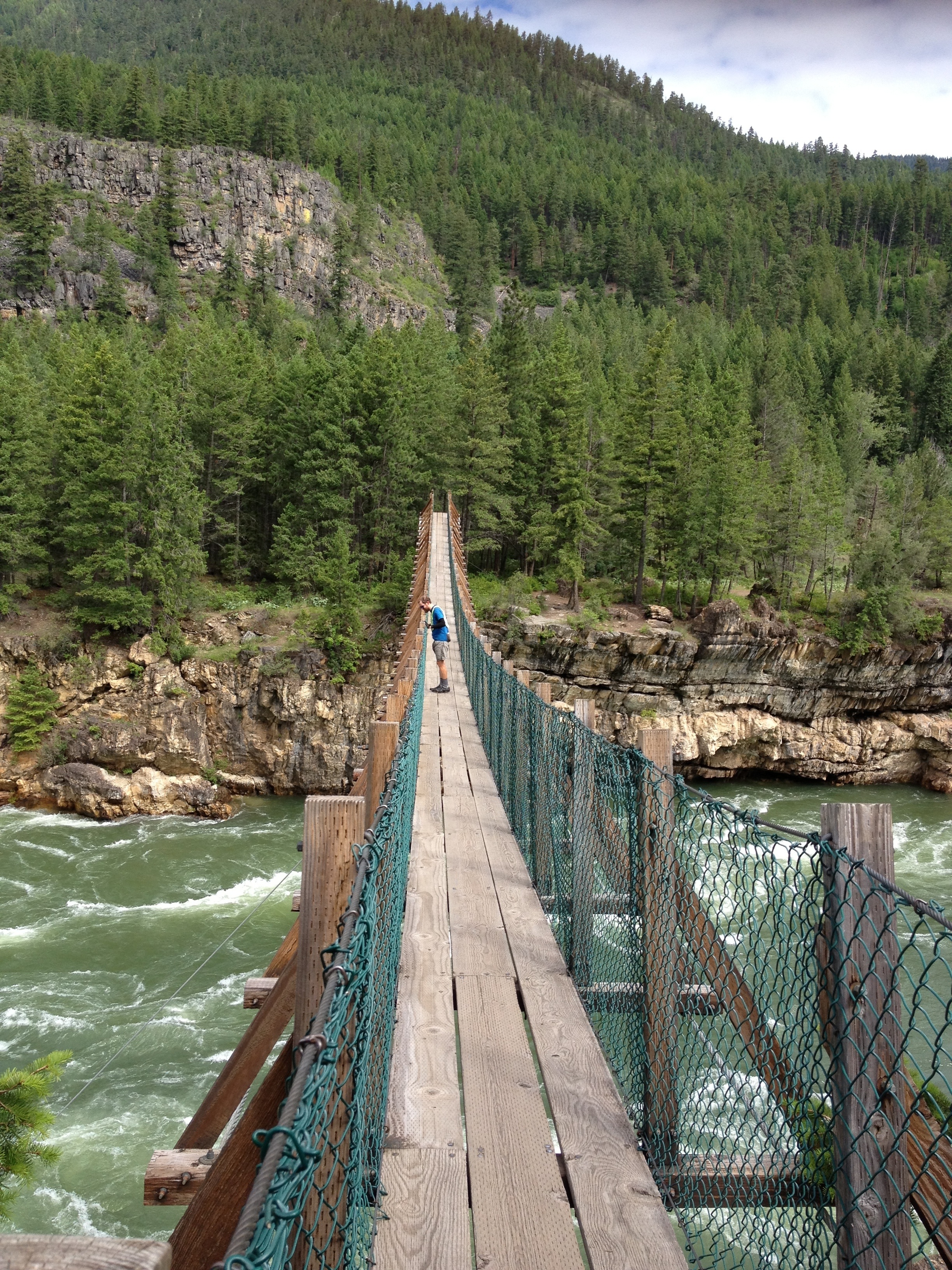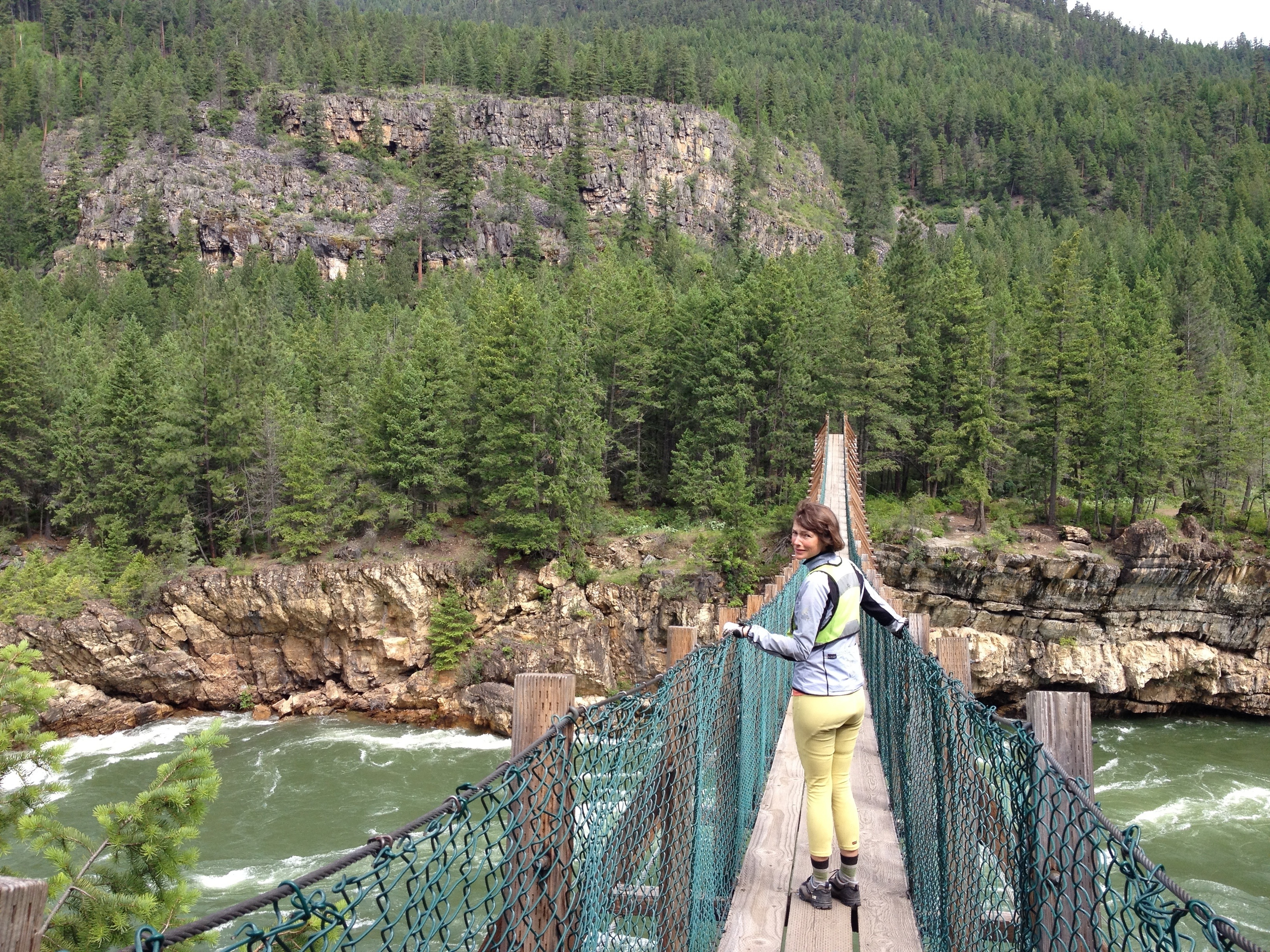 Out of Libby, we followed the Kootenai River west and saw the falls and attempted to cross the river on a suspension bridge, which some of us had more success with than others: