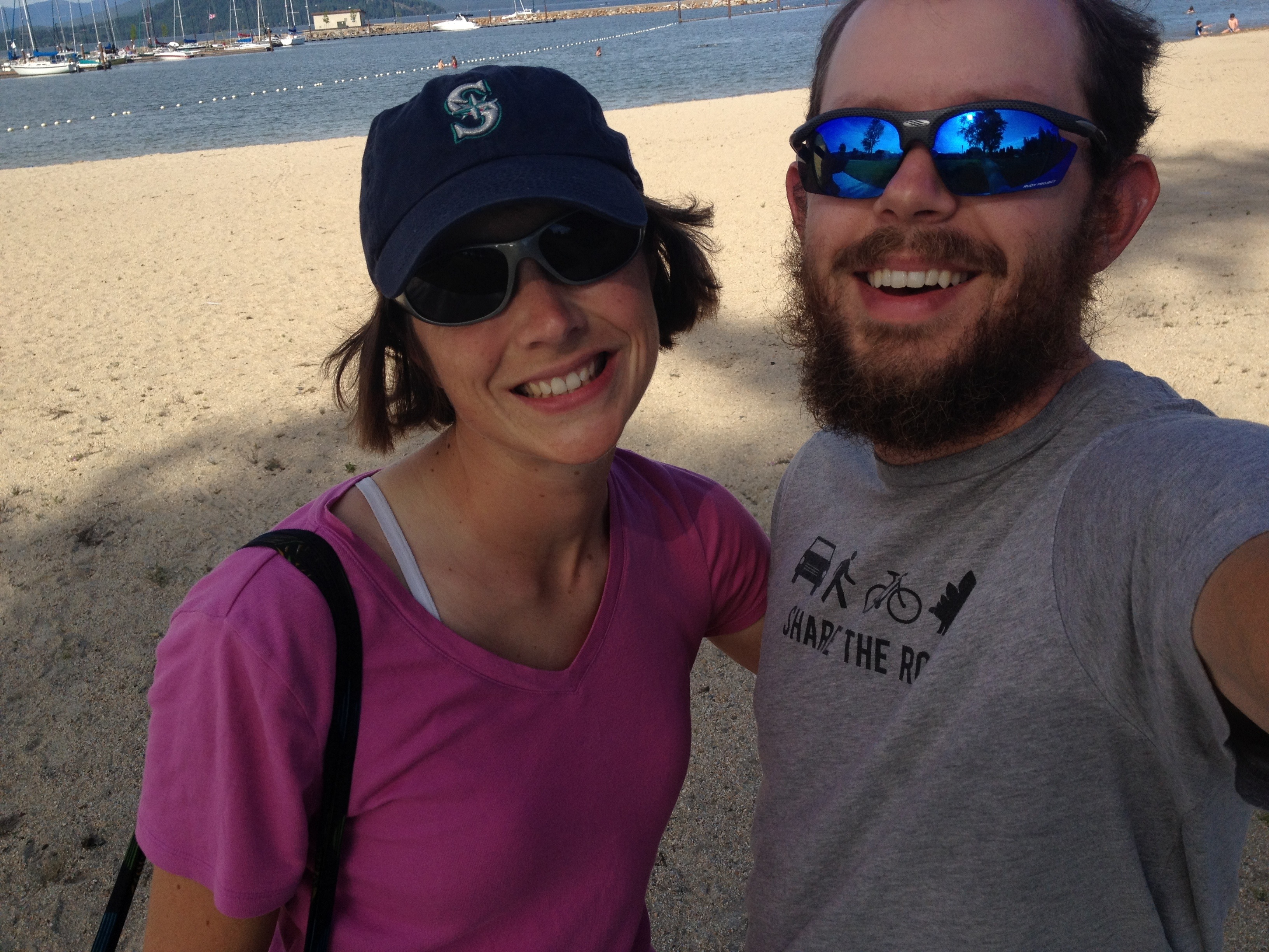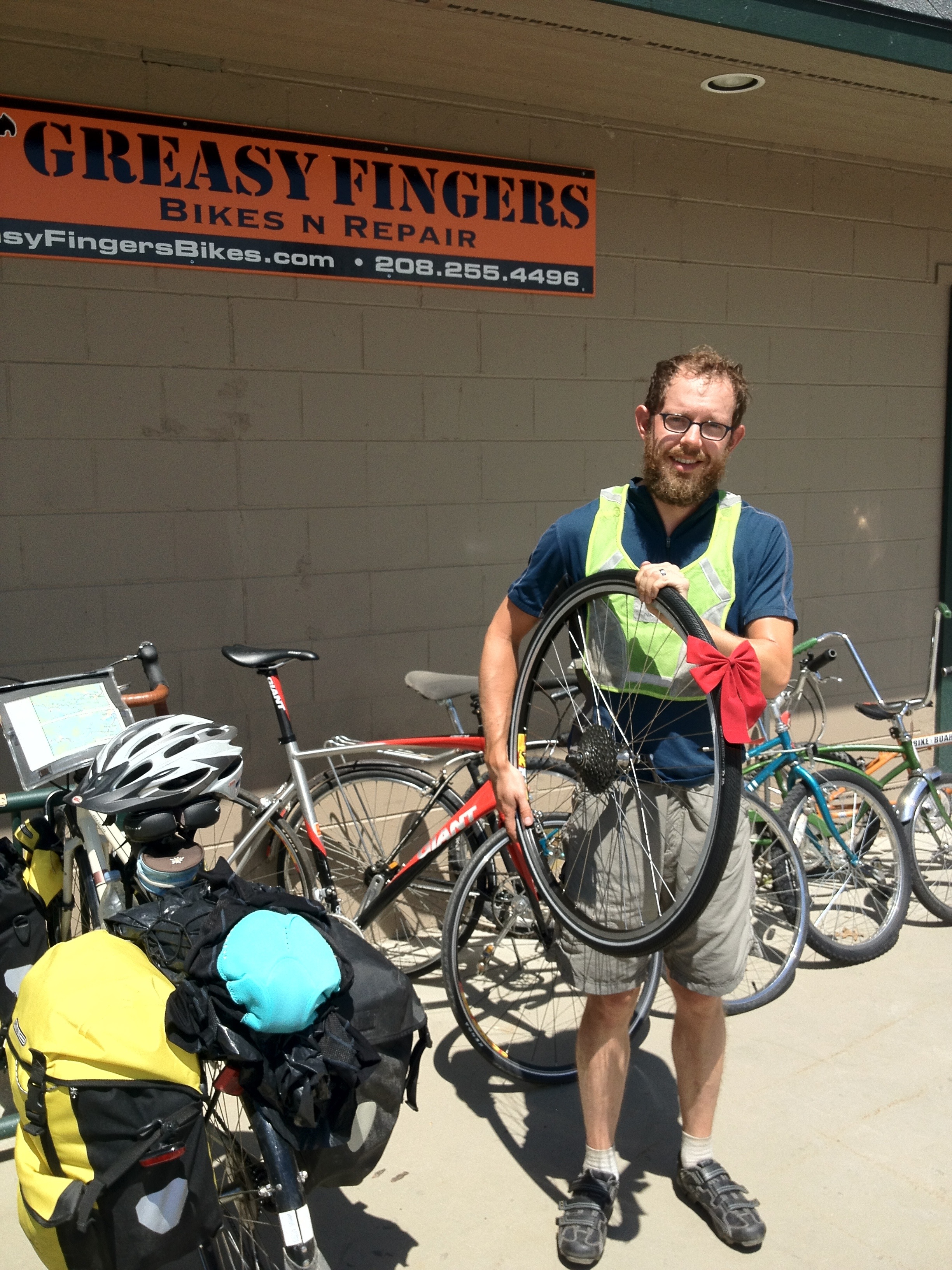 Despite my rear wheel being flat again when we woke up yesterday morning, we made it in to Sandpoint, land of surprisingly warm temperatures, beaches, and bike shops. We found new tires easily, and got Susan some spiffy new cycling shoes as well (the old ones had chronic problems with the cleat not staying in place basically due to poor design), but the issue with my rear wheel proved less tractable.