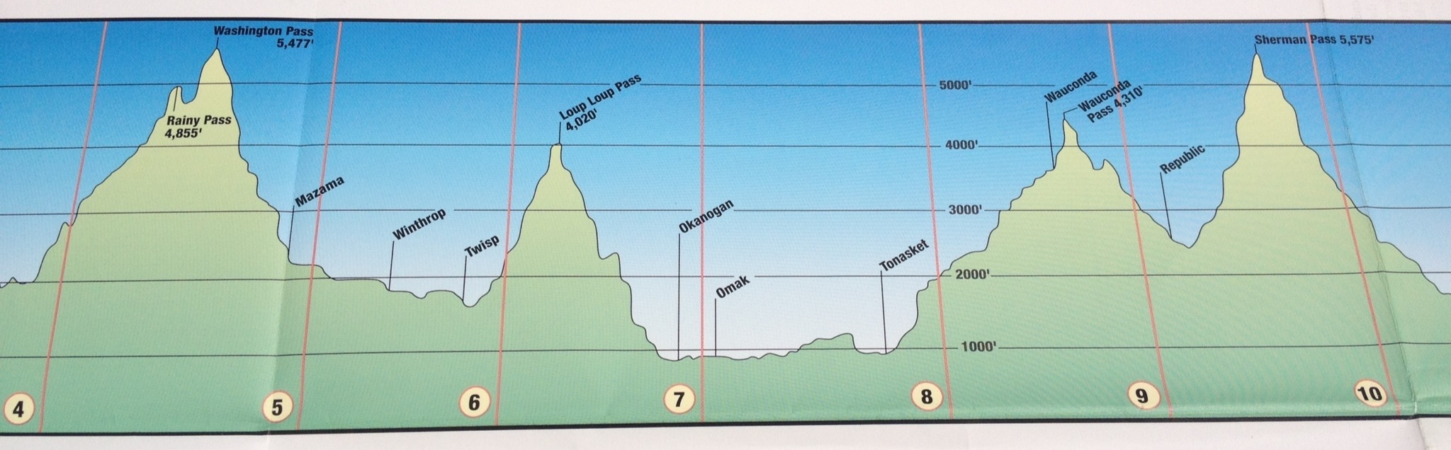 Short distances aside, we have our most difficult cycling coming up, as we take the high passes of WA-20 over the Cascades. Here’s the route profile showing the four big passes, all of which are much, much more intimidating than little old’ Marias Pass over the Rockies: