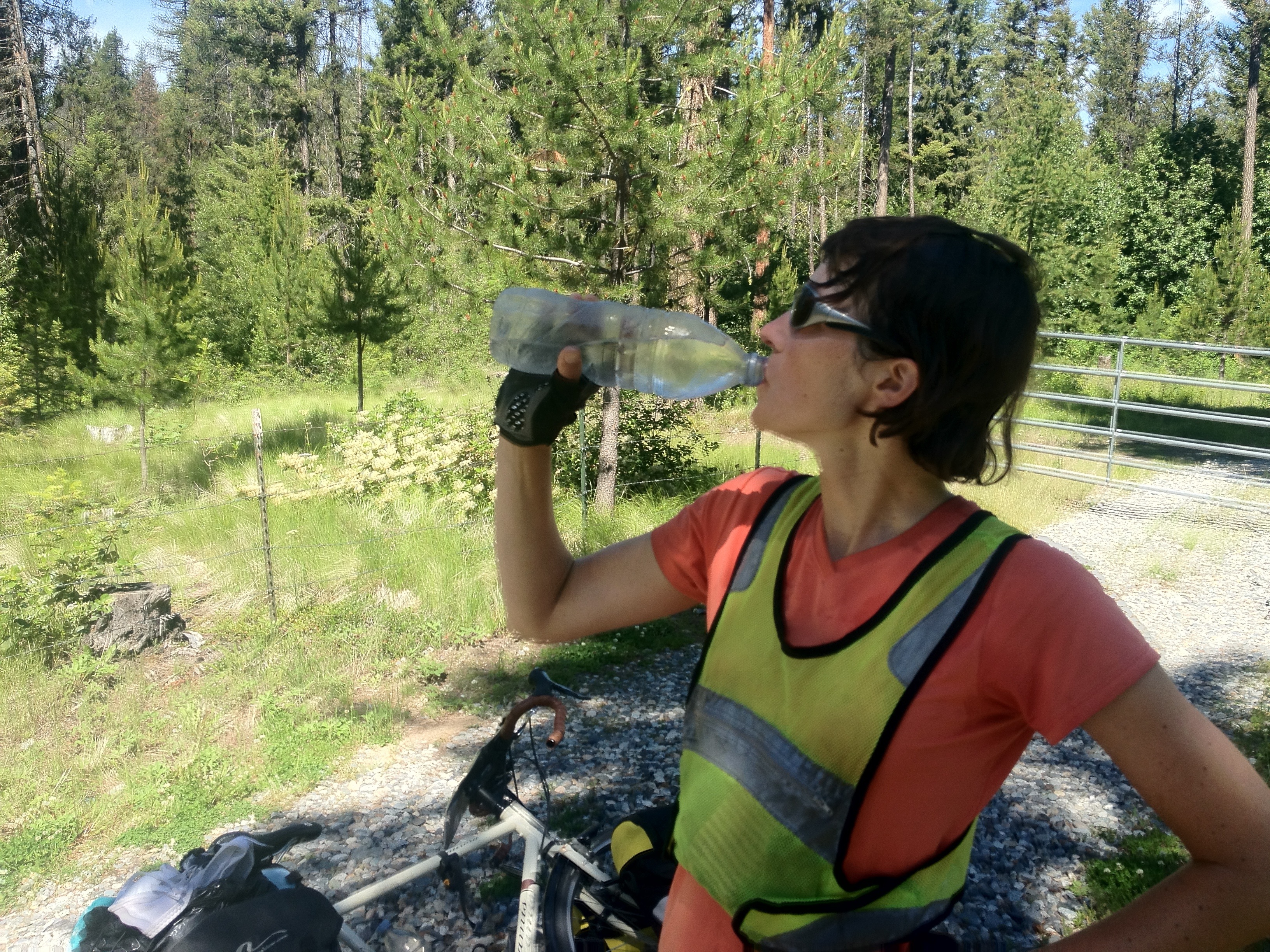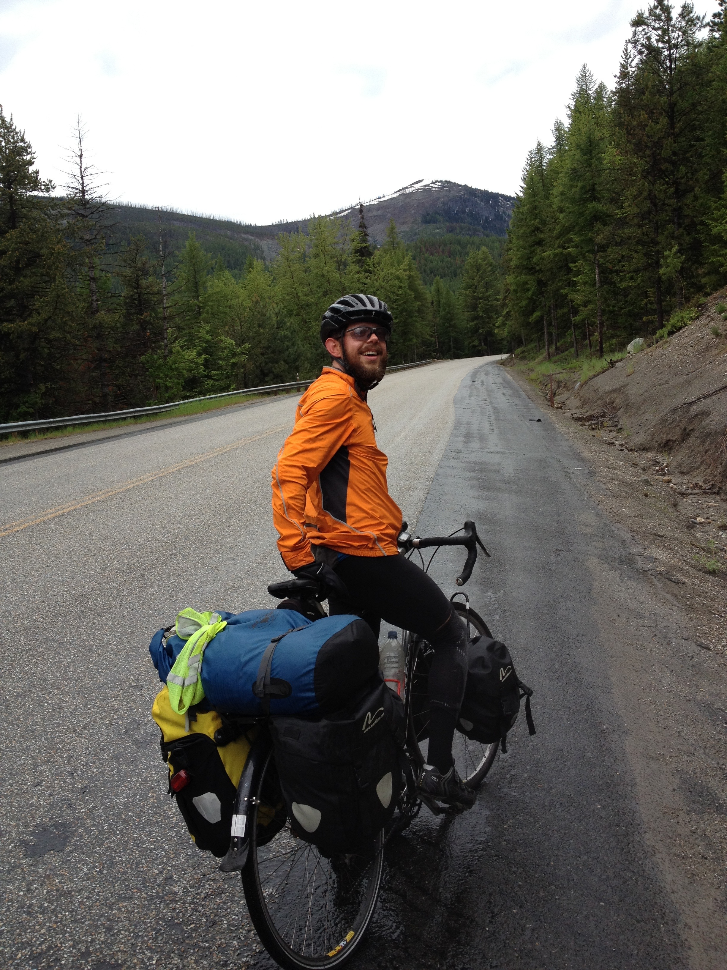 We started up the hill and it promptly started raining, continuing with varying intensity for the next 3.5 hours. It’s pretty easy to stay warm while moving, but we had to take very short breaks to not get chilled while stopped. We kept up slow but steady progress until the rain finally let up with a few miles to go. Unfortunately between my fogged glasses and the rain washing sweat into my eyes (easily the worst part of biking in rain) I didn’t get to see much scenery, but I’m pretty sure there were a lot of trees and some clouds.