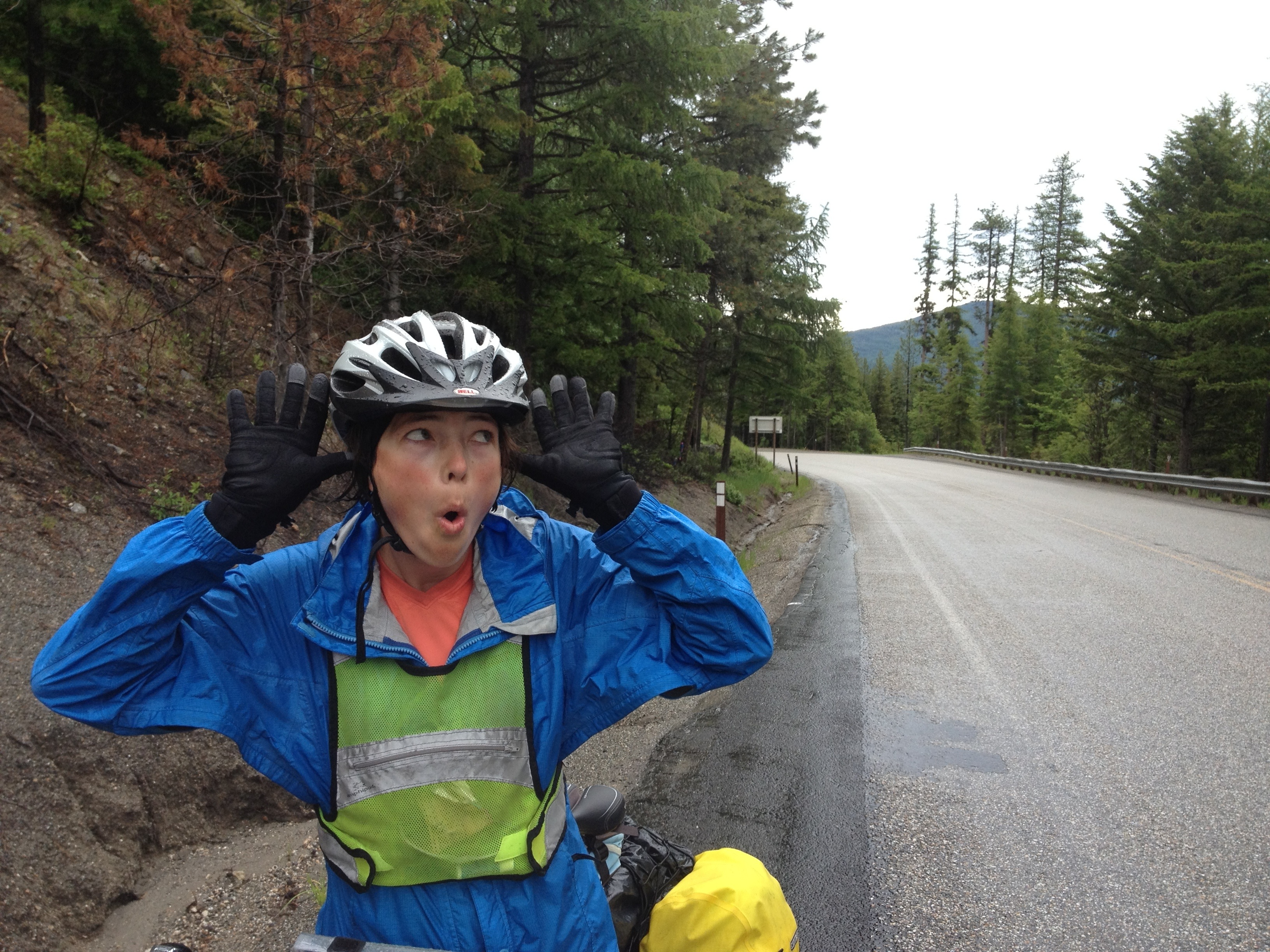 Tonight we’re in Kettle Falls, at the base of the enormous Sherman Pass. Getting here today the weather was schizophrenic–the rain would start coming down and we’d have to stop and put on all our layers, and then the sun would come out and it’d get hot and humid and we’d have to stop again and take everything off. There was pretty scenery:
