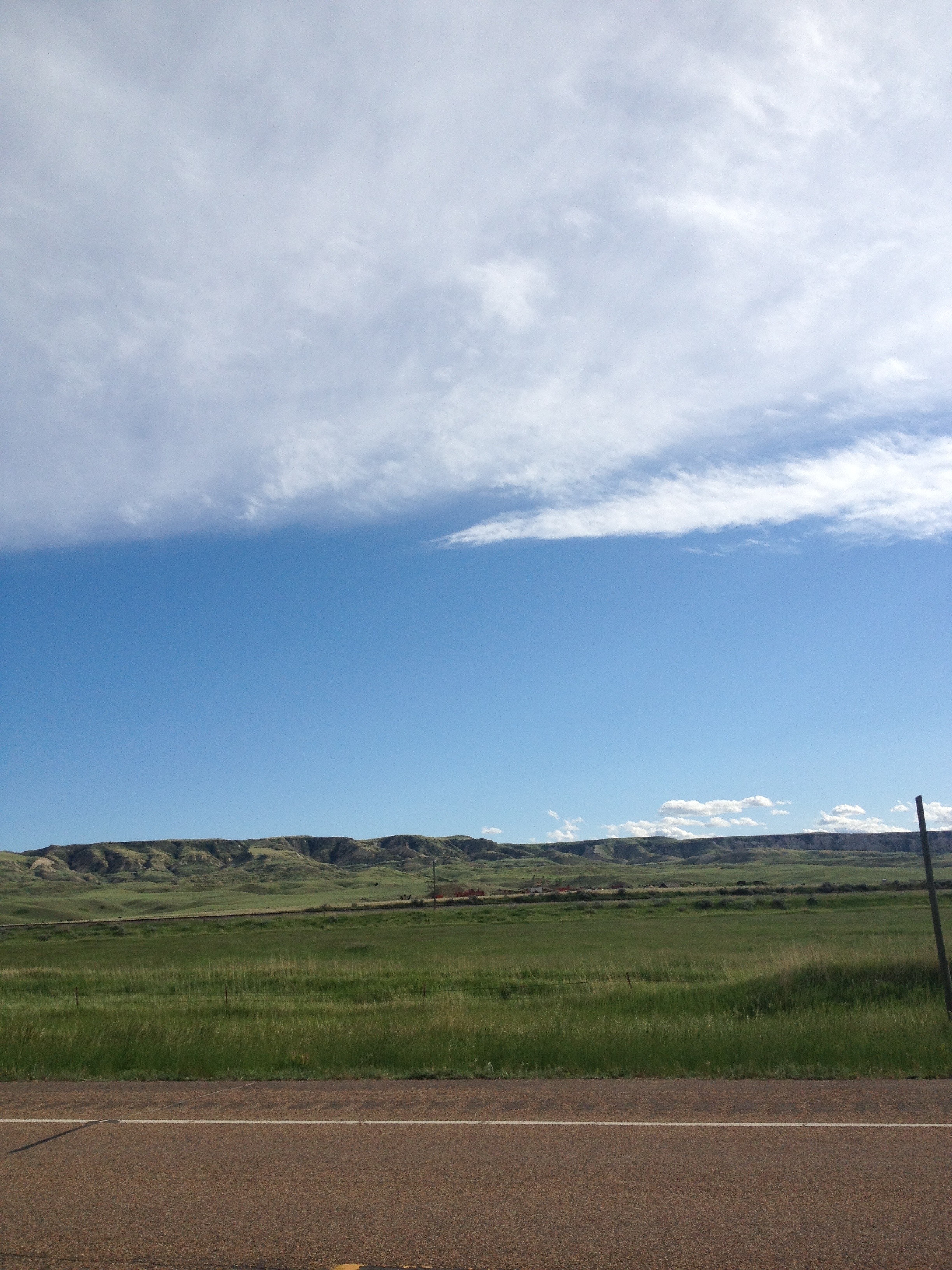 Today we had a tailwind for most of the day, until just east of Fort Belknap Agency when the wind stopped and then turned straight around. Here’s our hypothesis for how this happened: Most of the day we were biking towards a ginormous storm system, which we passed just south of on the road to Fort Belknap Agency. The storm is a low-pressure zone that sucks the air towards it from all sides. So once we went on the other side of the storm we were moving opposite of the movement of the air and thus the tailwind became a headwind. Physics! It works, kids!